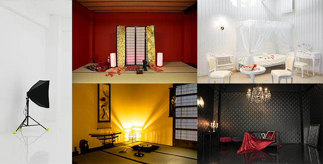 1Fは白ホリゾント(幅5m奥行き7m)&メイクルーム、2Fは妖艶な赤壁と落ち着いた色調の和室、豪華なシャンデリアのある黒ゴシックと白を基調としたクラシカルな洋室、屋上はウッドデッキや白く塗られた木柵に囲われた空間に人工芝を設置。さらに夏期は幅4m奥行き2mのプール(オプション)も利用可能。現在これらのシチュエーションが全て使えるお得な貸切りパックをご用意しております。