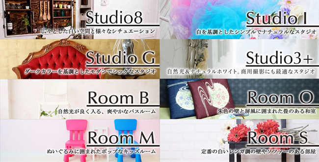 大阪難波の8つの撮影用レンタルフォトスタジオです。1時間からご利用可能な、多彩な撮影シチュエーションをご用意。用途に合わせて撮影をお楽しみください。同じビル内に全てのスタジオがあるので、1時間毎に違うスタジオでのご利用も可能です。コスプレ撮影や商品撮影、宣材、パネル撮影、キッズフォト、ウエディングフォト、マタニティフォトなどの記念撮影に☆