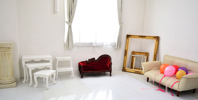 自然光が爽やかな南欧カフェ風スペースやデザイナーズ家具のあるシンプルな空間、異国の街角をイメージしたスタジオなど多彩なシーンが楽しめます。少人数向けスタジオでリーズナブルなお値段です。食器や食品サンプル、バルーン、造花などの無料のレンタル小道具も豊富です。