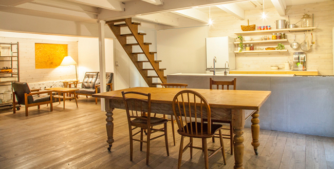 大きな窓から自然光が差し込む、ムービー撮影にも対応した大型のハウススタジオ。実用可能なアイランドキッチンがあり、料理スタジオとしても利用できます。フローリングのリビング・ダイニングスペース、俯瞰撮影が可能な2F、らせんの鉄階段、応接間風スペース、ベッドルーム等、多彩なロケーションがあります。同時2名一緒にメイクができるメイクルームあり。ライト類・バック材・食器・調理器具なども豊富です。窓の外からライティング、24時間撮影可、建て込み・作りこみも可能です。平日は1時間より撮影可。TVCM、番組等の使用実績もあり、多くのお客様から人気のスタジオです。ヘリンボーンのフローリングと廃材を使ったフローリングもございます。