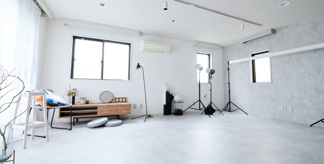 スタジオでは白背景をメインにした写真・動画を撮ることができ、物撮りに適したリビングボードやデザインチェア、ランプ、ミニテーブル等も配置。着替えエリア有り、豊富な機材、撮影用の小物ありで、あなたのクリエイティブを写すことができるスタジオです。アクセスもよく、近くに駐車場もあります。