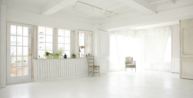 白を基調とした3面採光の自然光ハウススタジオです。1日中光が入り、各窓面にはそれぞれ異なるシーンを表現しました。移動出来る壁パネルもあり、豊富なシーンバリエーションを創造していただけます。1日10hのパック料金有ります。