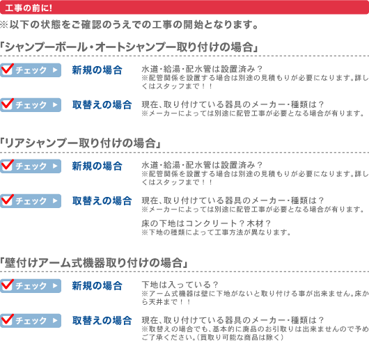 ビューティガレージは、サロン様の“困った”をお手伝いいたします。「組立・設置までやって欲しい」や「水回りの器具が壊れて取り替えたい」「取り付け業者が見つからない」などの場合はビューティガレージにおまかせください。当社で器具販売のみならず、その組立・取り付け設置工事までしっかりカバーさせて頂きます。