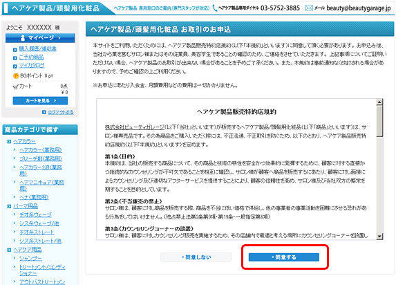 「ヘアケア製品/頭髪用化粧品販売特約店規約」への同意をいただき、お取引申し込みを完了します。お申込完了時に、当社よりお取引お申込確認メールが送信されます。
