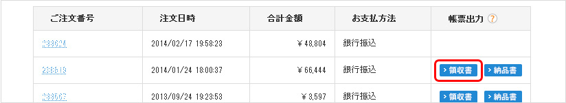 ※「領収書発行」ボタンは、ご注文・お支払い完了後、領収書の発行が可能となったご注文に対して表示されます。