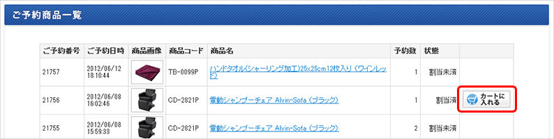 3. 入荷した商品に「カートに入れる」ボタンが表示されていますので、「カートに入れる」ボタンをクリックしてください。