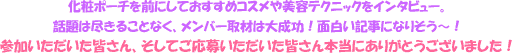 @cosmeメンバーの顔が見えるオリジナル本を目指し取材にご協力いただけるメンバーを募集したところ、多数の応募をいただきました。そして先日、抽選で選ばれたメンバー15人をお招きして、取材を敢行!わきあいあいと進んだ現場の模様をカメラに収めてきましたので、早速ご報告します♪そして今回は… | |