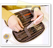 ブラシ収納ポケットが片面取り外せるのも意外と便利!細々した道具類が増えて、ケースに収まりきらなくなってきたら、収納ポケットを片面外して外付けにしてもいいですね。外に出してもブラシカバーがシッカリついているのでゴミ・ホコリ対策はバッチリですよ。