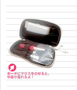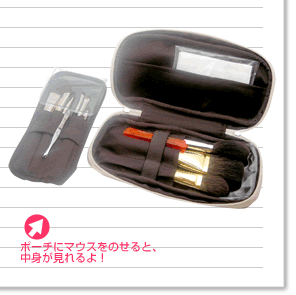 もっぱら外出用として使用しているのが、携帯サイズの方。収納ポケットを片面取り外して、空いたスペースにお直し用のパウダーファンデやアイシャドウ、フェイスパウダーなどを入れています。お直し時は、パウダーファンデをフェイスブラシでつけるのが好きなんですが、普通のポーチだとなかなか収納しにくい大ぶりのブラシもきちんと納まるので重宝してます。 |