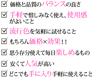 “手軽なお値段”はもちろん、“品質”や“コストパフォーマンス”にこだわる声が多く見られました! スキンケアには“たっぷり使えること”、メイクアイテムには“発色”“もちのよさ”を求める人が多く、少数派では“かわいいパッケージ”と見た目も期待するコメントが♪ ※フリー回答