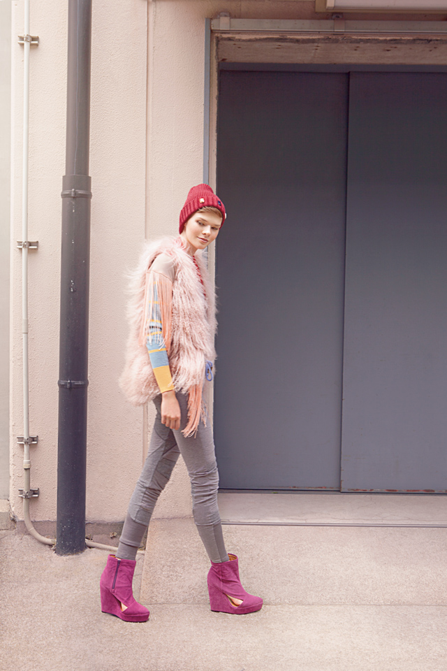 - Vest 29,400yen, Knit 7,770yen, Pants 6,930yen, Cap 3,990yen, Stole 3,990yen, Boots 11.970yen
