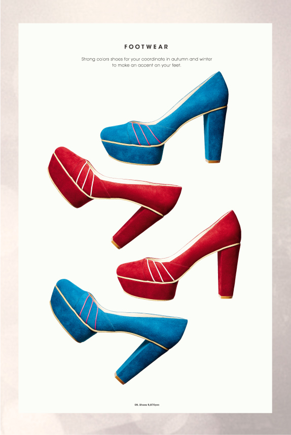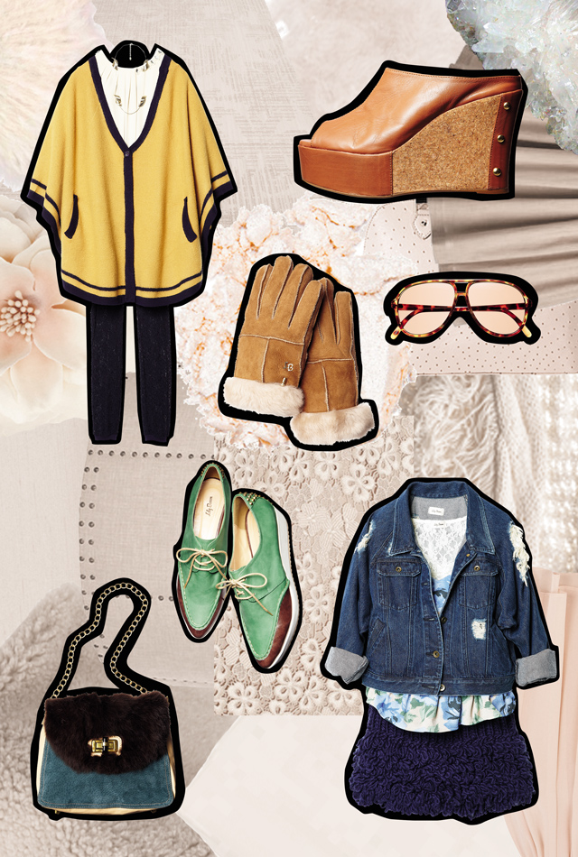 - A. Poncho 12,810yen, Blouse 7,770yen, Pants 5,880yen, Necklace 4,830yen, B. Shoes 12,810yen, C. Gloves 4,830yen, D. Sunglasses 2,310yen, E. Bag 10,920yen, F. Shoes 9,870yen G. Jacket 9,450yen, Camisole 6,930yen, Pullover 6,930yen, Skirt 8,820yen