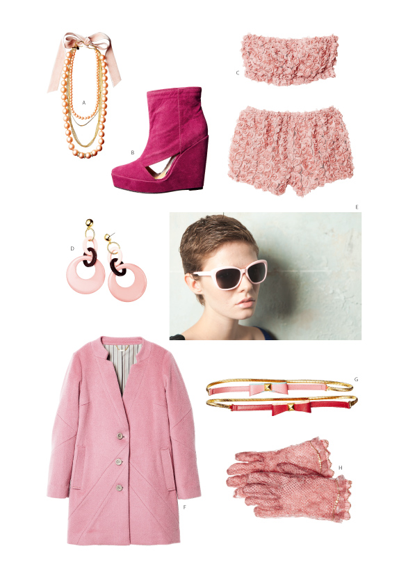 - A. Necklace 5,880yen, J. Boots 11,970yen, C. Bra 3,990yen, Pants 5,880yen, D. Stud earrings 2,520yen, E. Sunglasses 2,310yen, F. Coat 23,100yen, G Belt 4,830yen, H. Gloves, 3,990yen