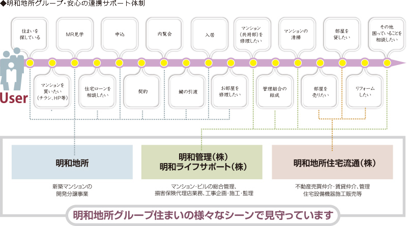 明和地所(株)はマンションデベロッパー(マンション開発者)という立場でありながら、グループ全体でお客様の資産管理まで、数多くのサポートが可能です。たとえば、「マンションを買い替えたい」、「急な転勤で家を貸したい」、「子供が結婚したので、家をリフォームしたい」、「バスルームやキッチンを修理したい」という場合には、明和グループの明和地所住宅流通(株)が対応させていただきます。マンションの共用部分(エントランスドアや廊下、階段等)を修理したいという場合には明和管理(株)が対応します。現在すでに、明和管理コールセンターはマンションライフで困ったこと、わからないことの相談窓口として大いに活用されており、何かがあった時には助けてくれる、いつも見守ってくれているという安心は、暮らしの充実感につながるに違いありません。