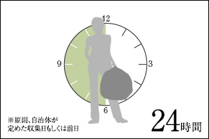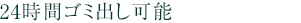 建物内に、24時間対応のゴミ置場(一時保管場所)を設置。外出のついでや深夜などに可燃ゴミ・不燃ゴミともに出すことができるので、たいへん便利です。
