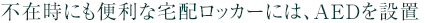 不在時に届けられた荷物をお預かりするだけでなく、宅配便の発送、クリーニングの受け渡しなども、24時間対応。さらに、AED(自動体外式除細動器)を設置。音声ガイド付なので、どなたでも簡単に使用することができます。