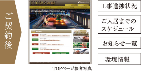 いつでも気軽に情報をチェックできる入居者専用HPを2段階で開設します。ご契約後から建設地の工事進捗状況やご入居までのスケジュール、周辺の生活関連情報などを掲載。ご入居後からは居住者向けの掲示板、管理会社からのお知らせ、さらには緊急時の連絡先などを掲載。安心で快適なマンションライフをサポートいたします。