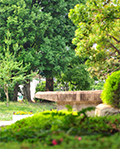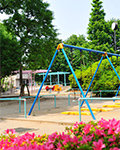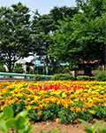 円形の花壇に敷き詰められた花が特徴。段差が少なく車イスでも利用できる公園。