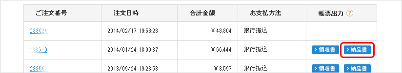 ※「納品書」ボタンは、発送完了後、納品書の発行が可能となったご注文に対して表示されます。